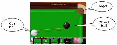 Target is where the object will stop at (or pass through). It is the red-dot you see on screen. You would normally wish move the target to one of the pockets. Object Ball is the ball to be struck by the cue ball. It is one of the red/colour balls. You would normally move the Object Ball to somewhere near the pockets. Cue Ball is the white ball which your cue would strike on. Position the cue ball anywhere on the table.